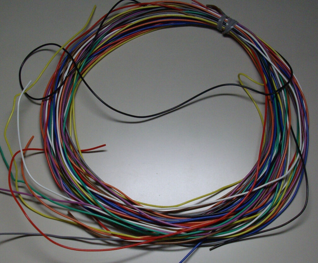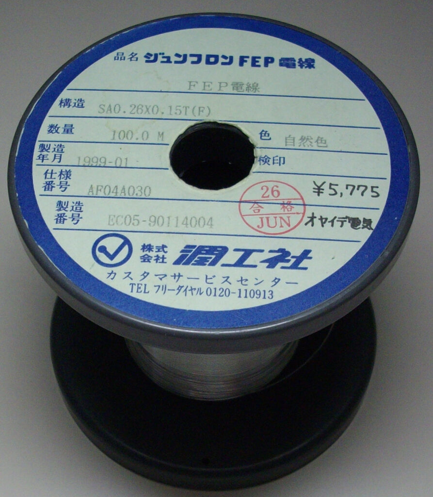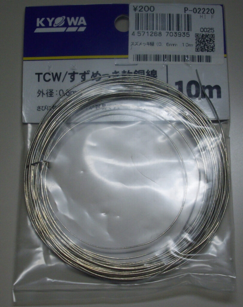 撚線(よりせん)を使うと作業が面倒で、しかも細い芯線のヒゲが出て隣りの配線とショートしたりするので、芯線が1本だけの「単線」を使います。
