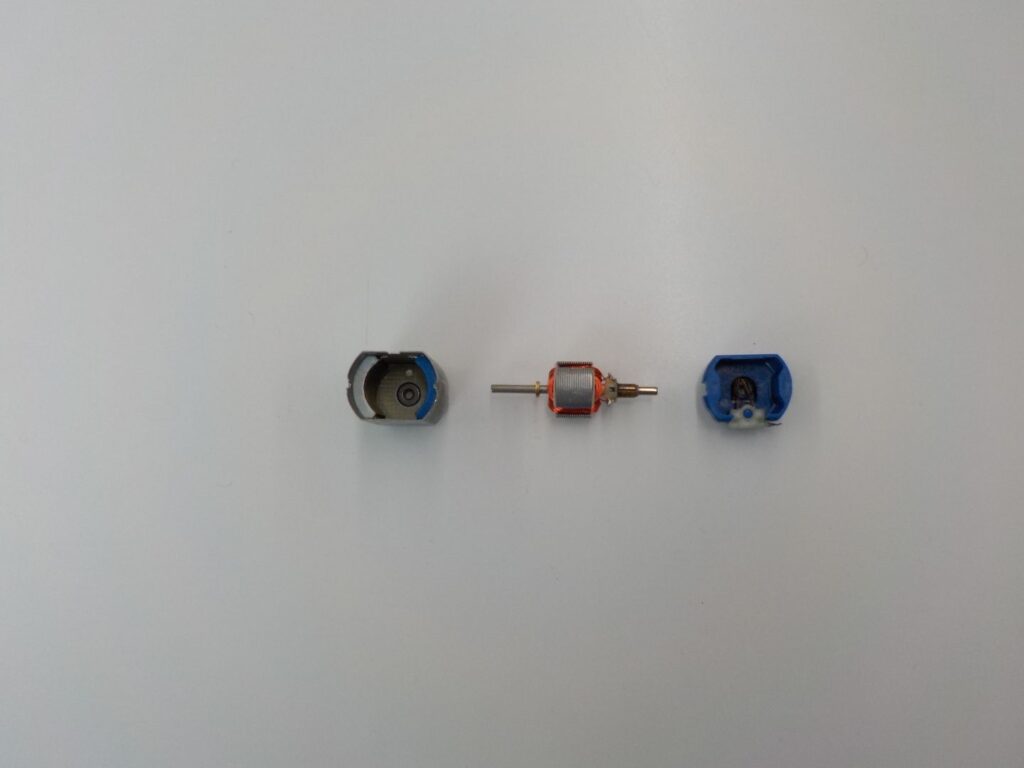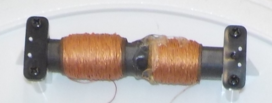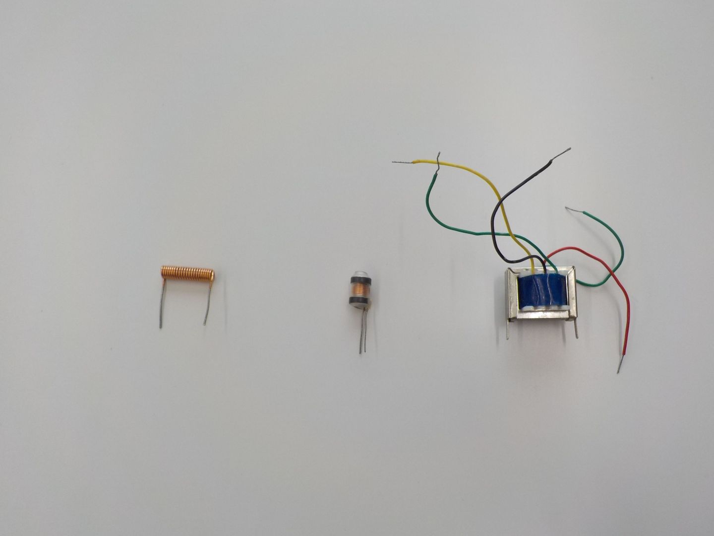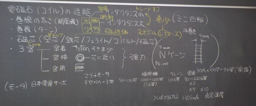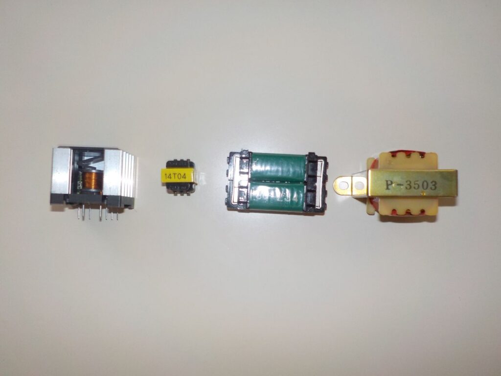 コイルは、エナメル線やポリウレタン線(マグネットワイヤー)などの絶縁された電線を巻いたもので、空芯(巻いただけ)と、磁心(鉄心やフェライト芯などに巻いたもの)があり、磁心があるほうがコイルの性質が強くなりますが、ひずみなどの特性が悪化するため、必要なインダクタンスが小さい場合は空芯が、低周波で使う変圧器(トランス)のように必要なインダクタンスが大きい場合は鉄心が、その中間の周波数(数百kHz~数十MHz)では、鉄粉と粘土を焼いて固めたフェライト芯が使われることが多いです。